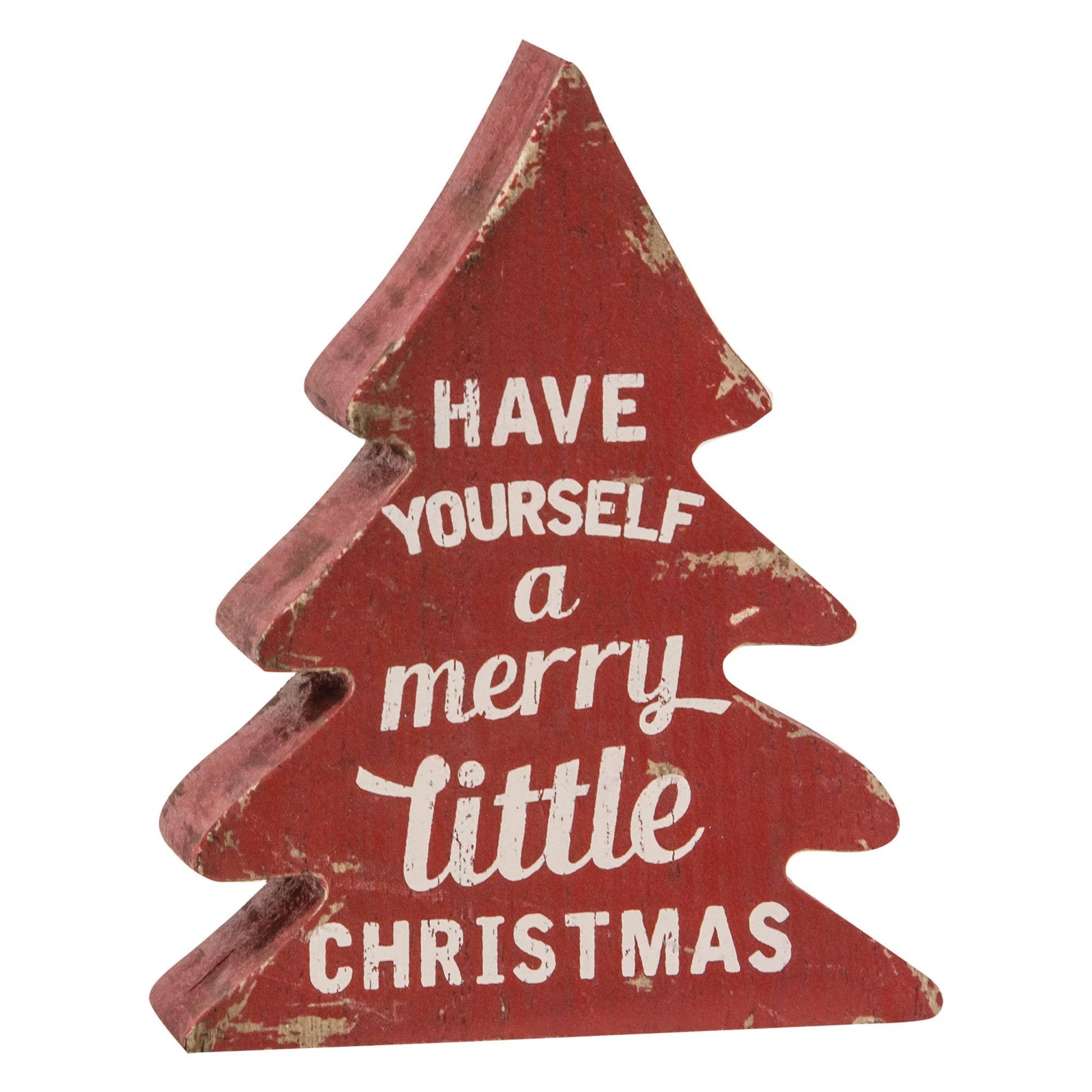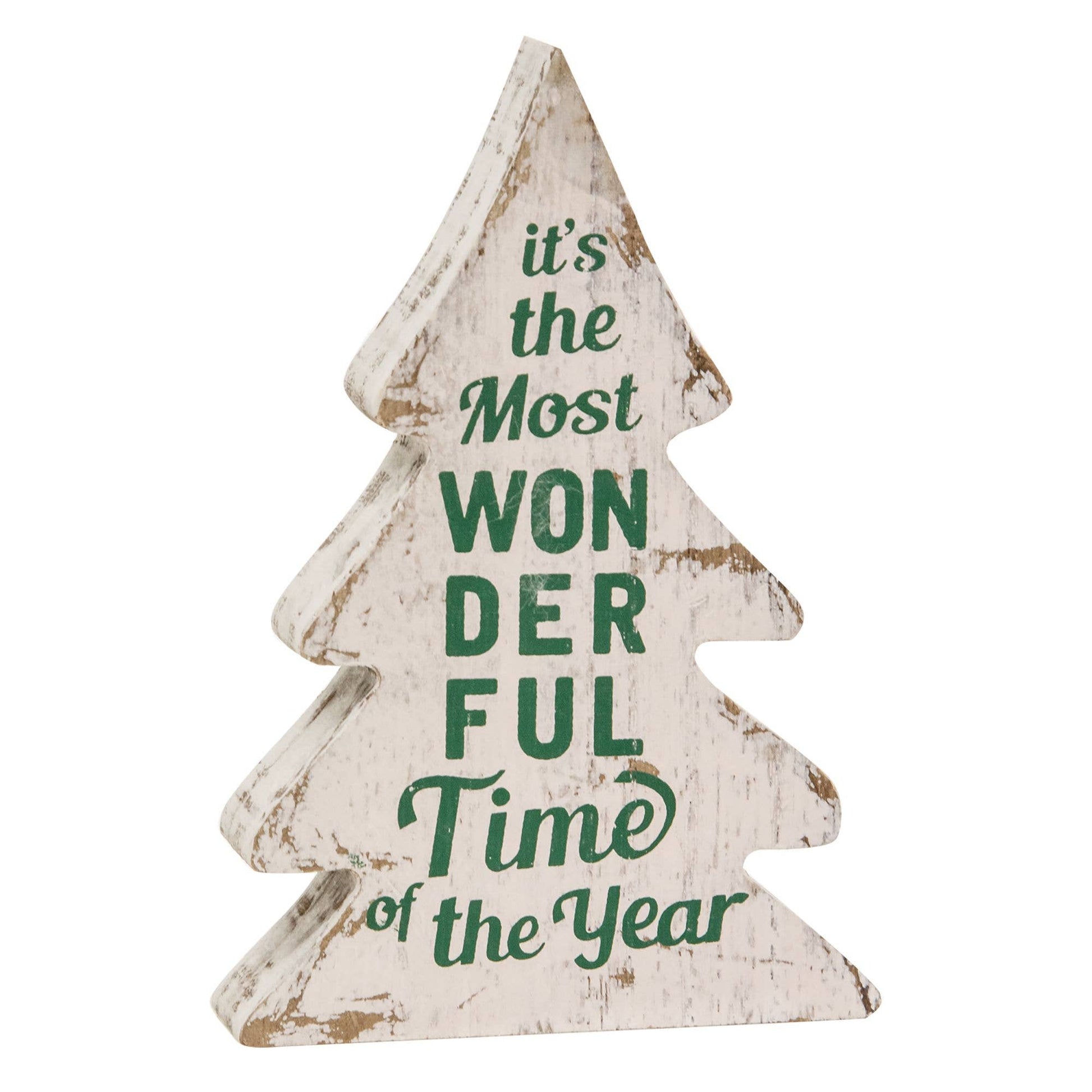 Wonderful Time of Year Distressed Wooden Trees is a set of three freestanding sitters. Trees have a distressed red, green, or white finish and read, "it's the most wonderful time of the year," "believe in the magic of Christmas," and, "have yourself a merry little Christmas" in bold white or green lettering. Measures 3.5" high by 2.5" wide by .75" deep; 4.5" high by 3.5" wide by .75" deep; 5.5" high by 3.5" wide by .75" deep.