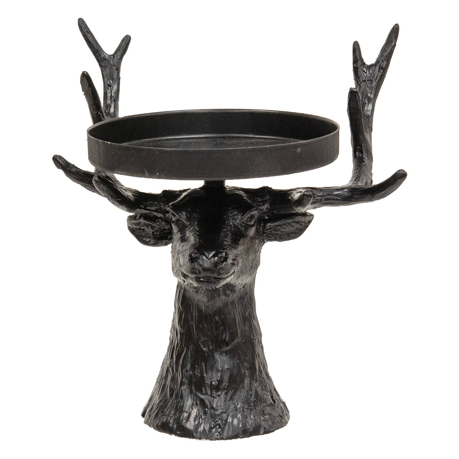 Add a touch of festive elegance to the farmhouse with the Black Metal Reindeer Pillar Candle Holder. Standing 5.5" tall by 5.25" long by 4.25" wide, this striking piece features the graceful silhouette of a deer’s head, complete with intricately designed antlers that frame a round plate for displaying a pillar candle. The sleek black finish lends a contemporary yet timeless charm. This reindeer candle holder combines rustic appeal with modern sophistication, bringing a touch of nature-inspired beauty to displays with red-berry greenery and glittered-finish pillars.
