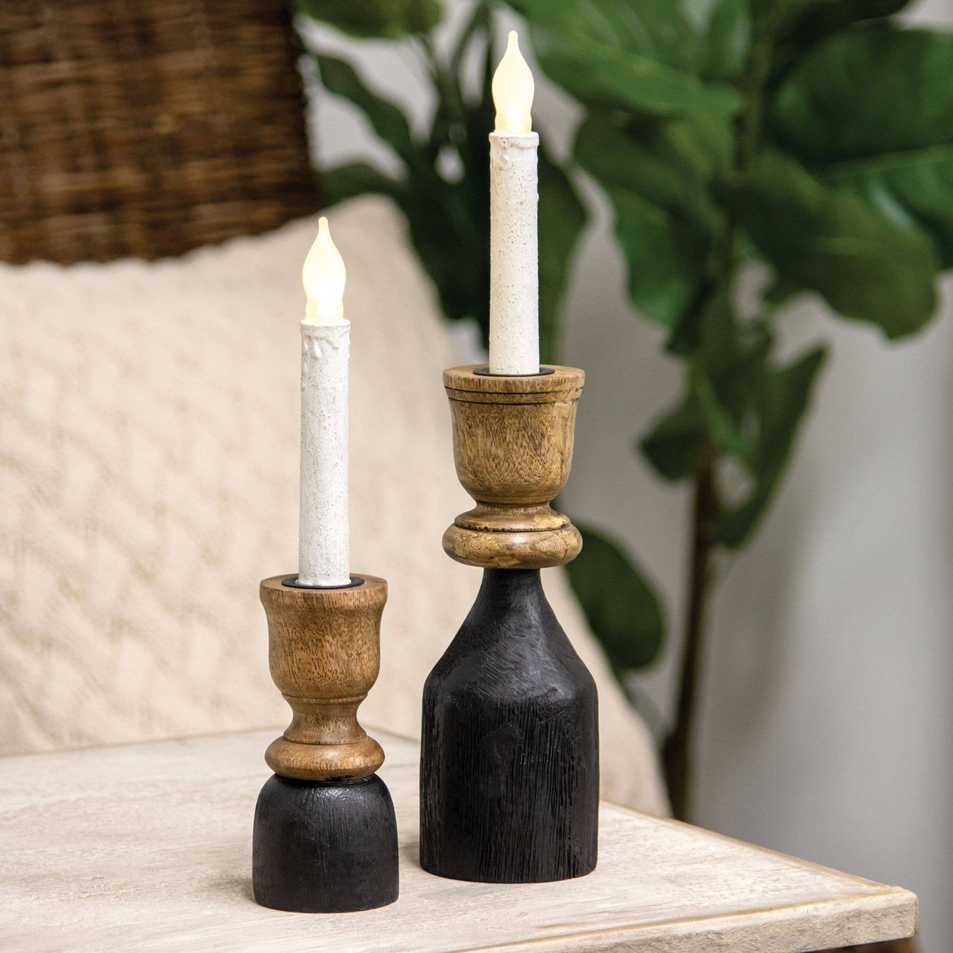 The Black & Wood Taper Candle Holder, 5.25" Tall is a great accent for any farmhouse display. This holder features a unique design with a natural wood top and a black finish on the wooden base. It measures 2.25” in diameter and 5.25” in height. The holder opening has a black metal plate to secure the candle. Pairs well with a variety of styles and accommodates all of our battery-operated taper candles.