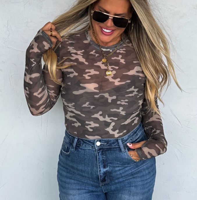 Turn heads in these trendy mesh long sleeve tops, designed for a sleek and stylish fit. Super cute for layering, this sultry stretchy mesh print long-sleeve top features a totally sheer design. The camo print has a bold, edgy vibe, while the cheetah print brings a flirty, fierce flair. Perfect worn alone or paired under your favorite cardigan, vest or sweater!