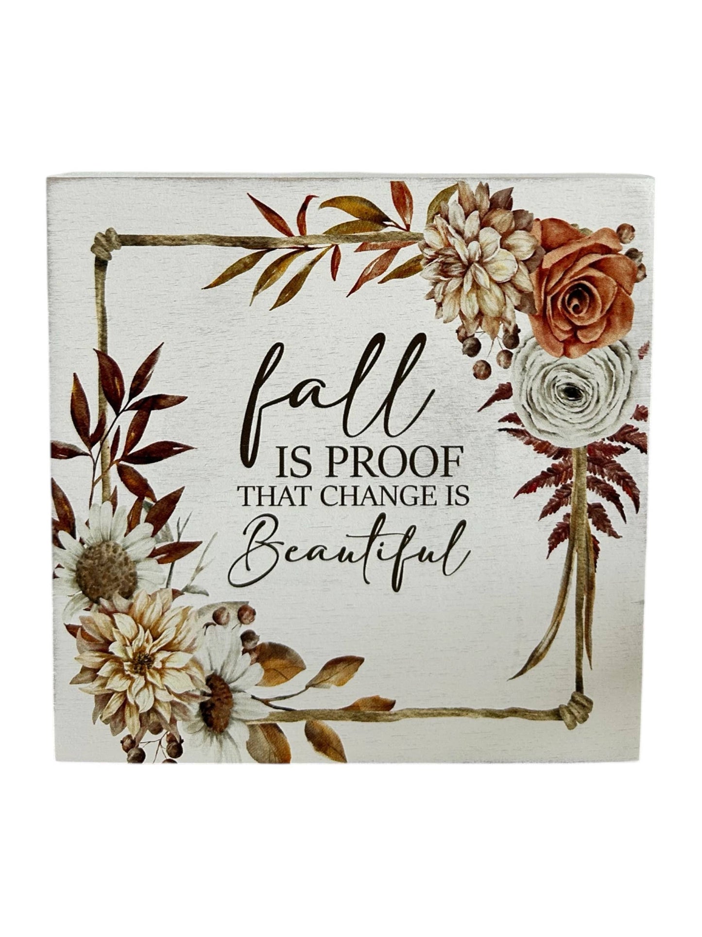 Fall/Autumn design printed on a wood sign created on 3/4” hardwood ply with a finished back. Painted white, lightly sanded and printed on the front with UV cured ink.