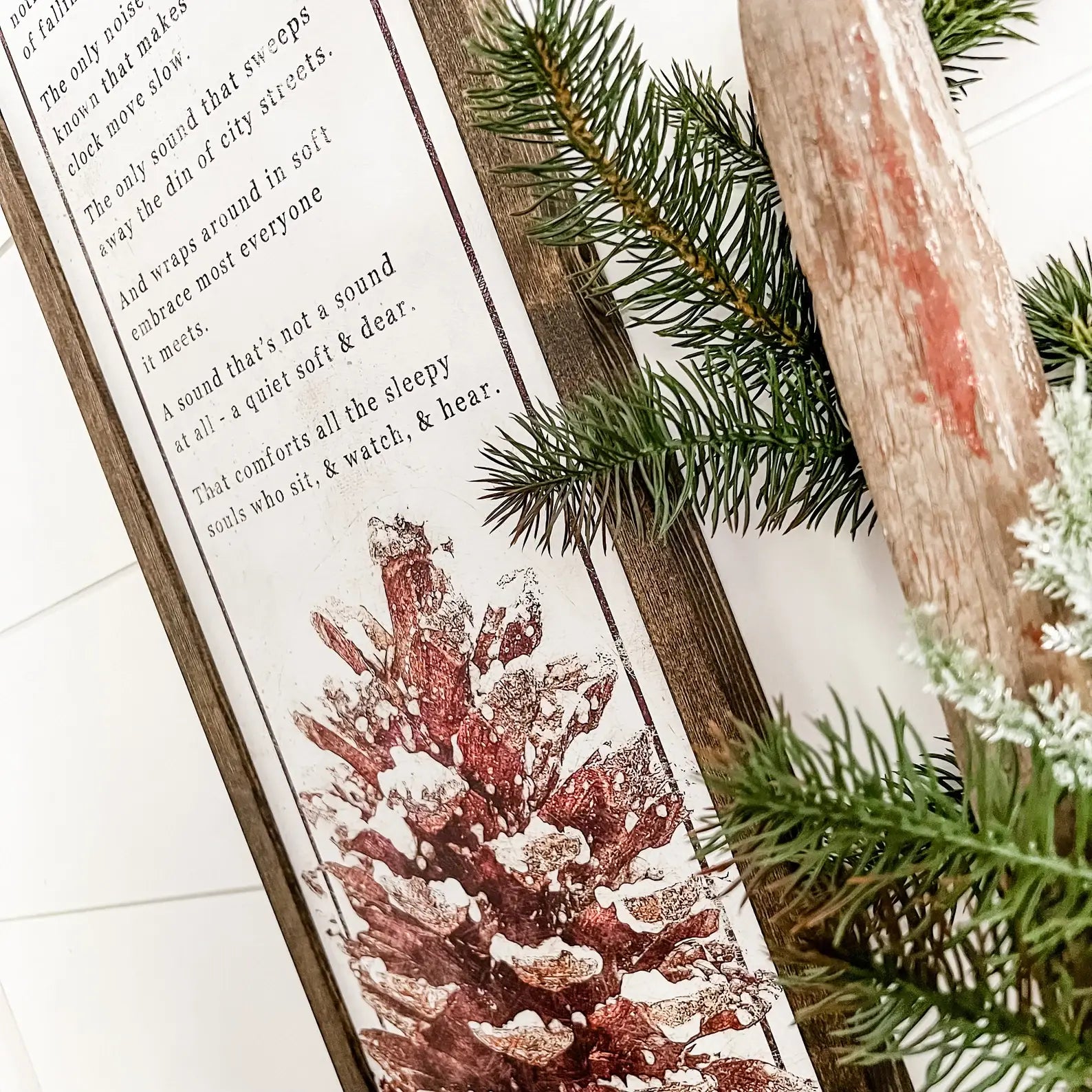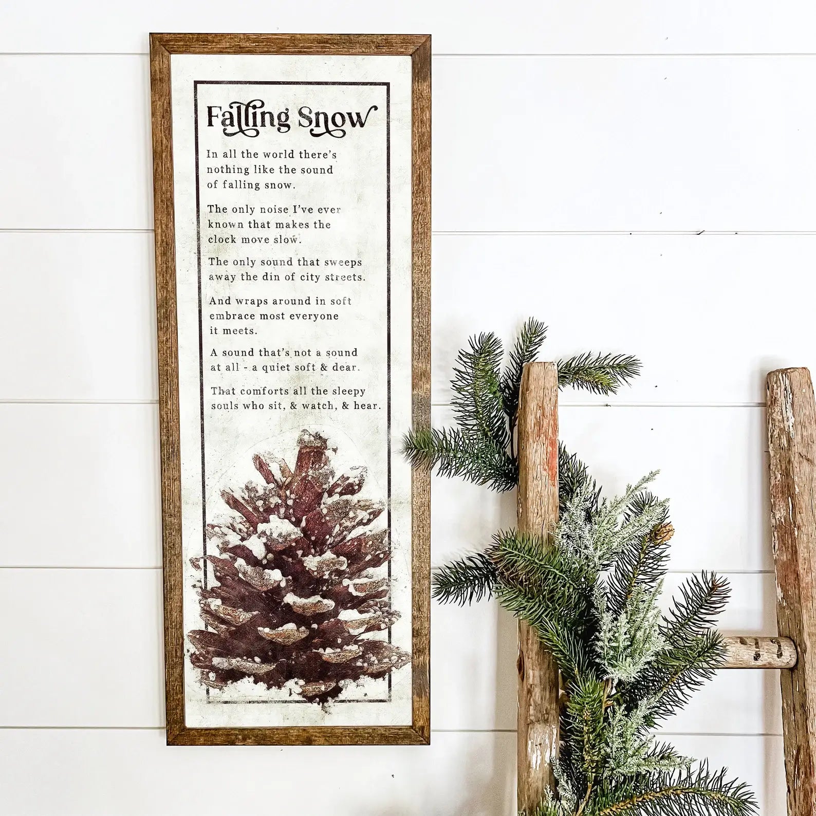 Handmade wooden sign with falling snow winter quote. Printed on wood and framed in dark pine stained wood.v
