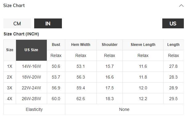 | Size | Bust | Hem Width | Shoulder | Sleeve Length | Length |