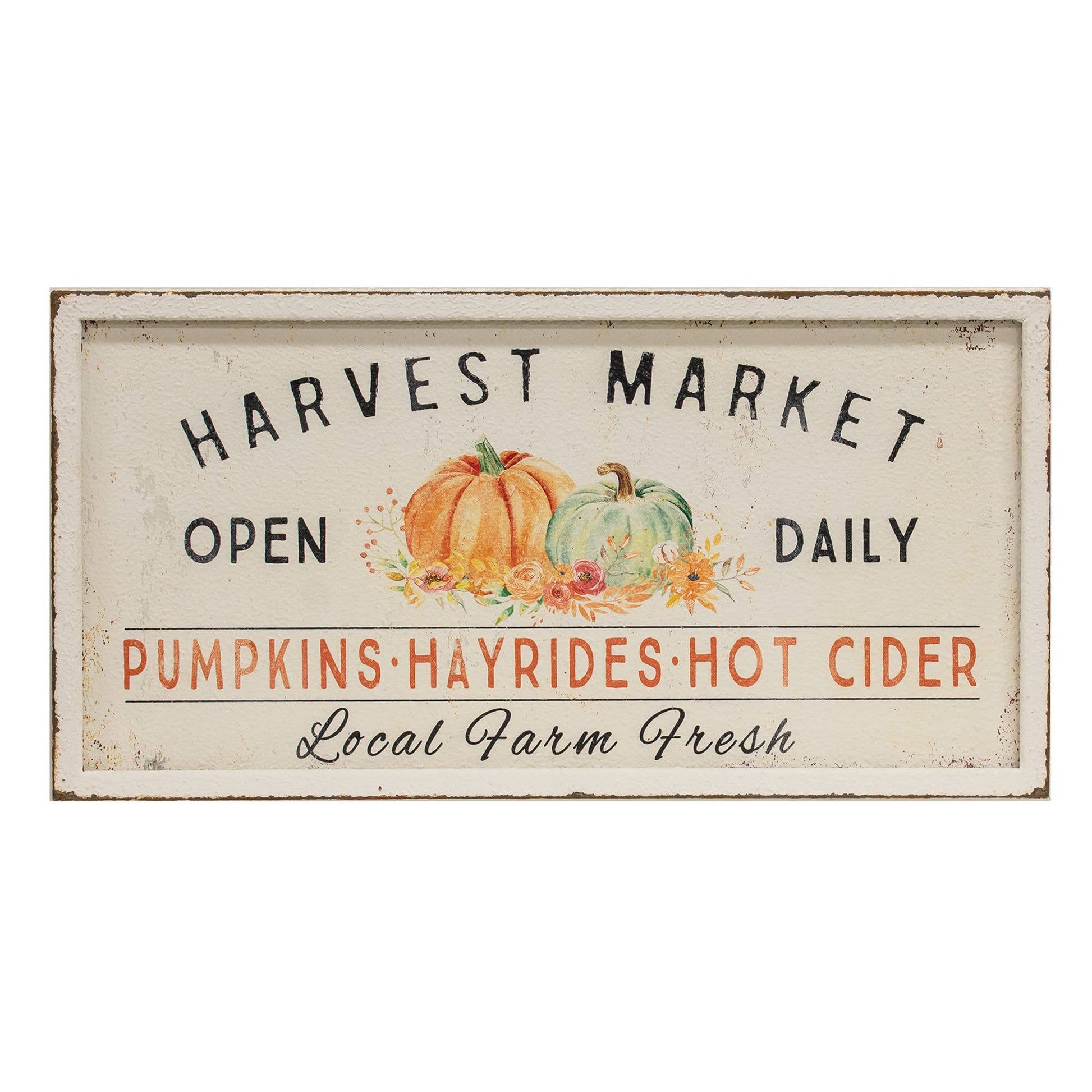 Harvest Market Open Daily Pumpkin Metal Sign is a metal sign with a heavily distressed white finish for a vintage look. Sign reads, "Harvest Market - Open Daily - Pumpkins - Hay Rides - Hot Cider - Local Farm Fresh" in black and orange text and it is accented by a green and orange pumpkin illustration. It comes with two pre-installed sawtooth hangers for easy wall display and measures 9.25" high by 18" wide by .75" deep.