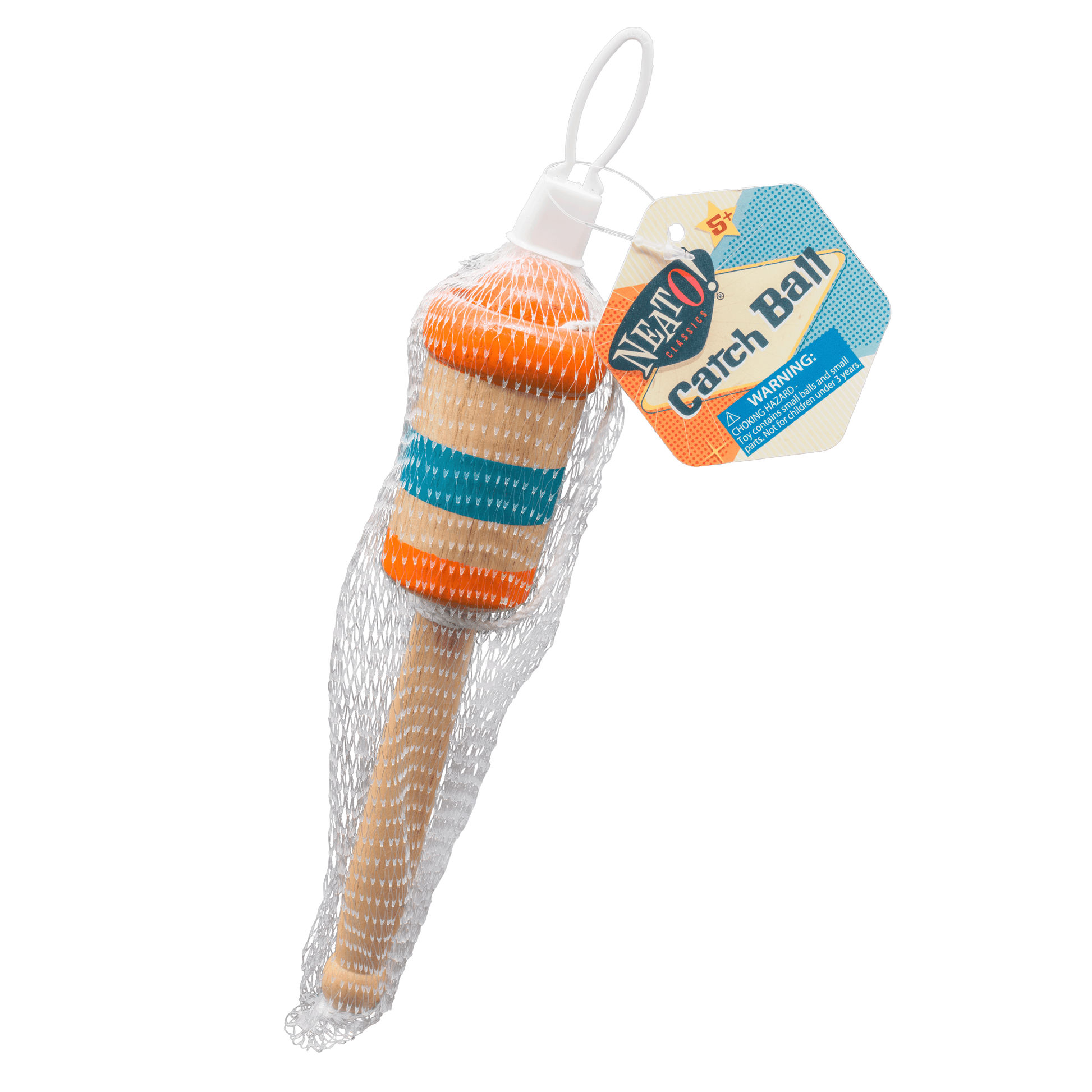 A modern version of a retro toy, this extremely popular wooden catch ball game from Neato! is ready to play. Beautifully designed with a shiny orange wooden ball tethered to the base of the blue-and-orange striped wooden cup by a cotton string. Measures 7.5 inches long. The handle is round with a bulbous end for easy gripping. Crafted with sturdy, high-quality wood for a classic look and long-lasting play. Great for hand-eye coordination as well as reflex, agility, and balance. No assembly required. Each Wooden Catch Ball toy comes in a net bag.