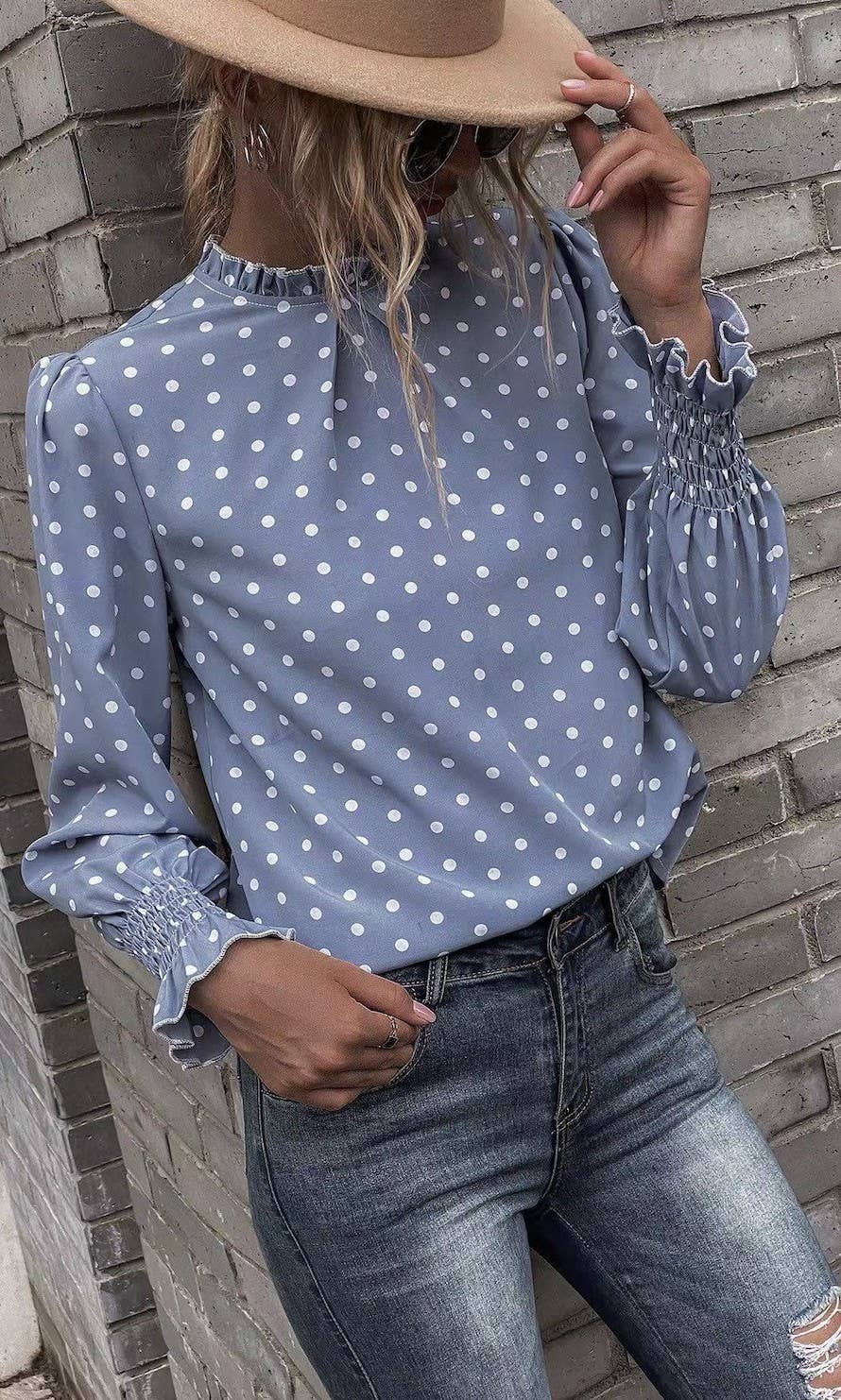 "Frances" Polka Dot Print Lantern Sleeve Blouse