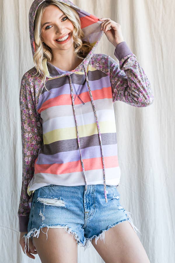 A KNIT MULTICOLOR STRIPE SWEATSHIRT FEATURING A FLORAL CONTRAST, DRAWSTRING HOODIE, CURVED HEM AND RAGLAN LONG SLEEVES.