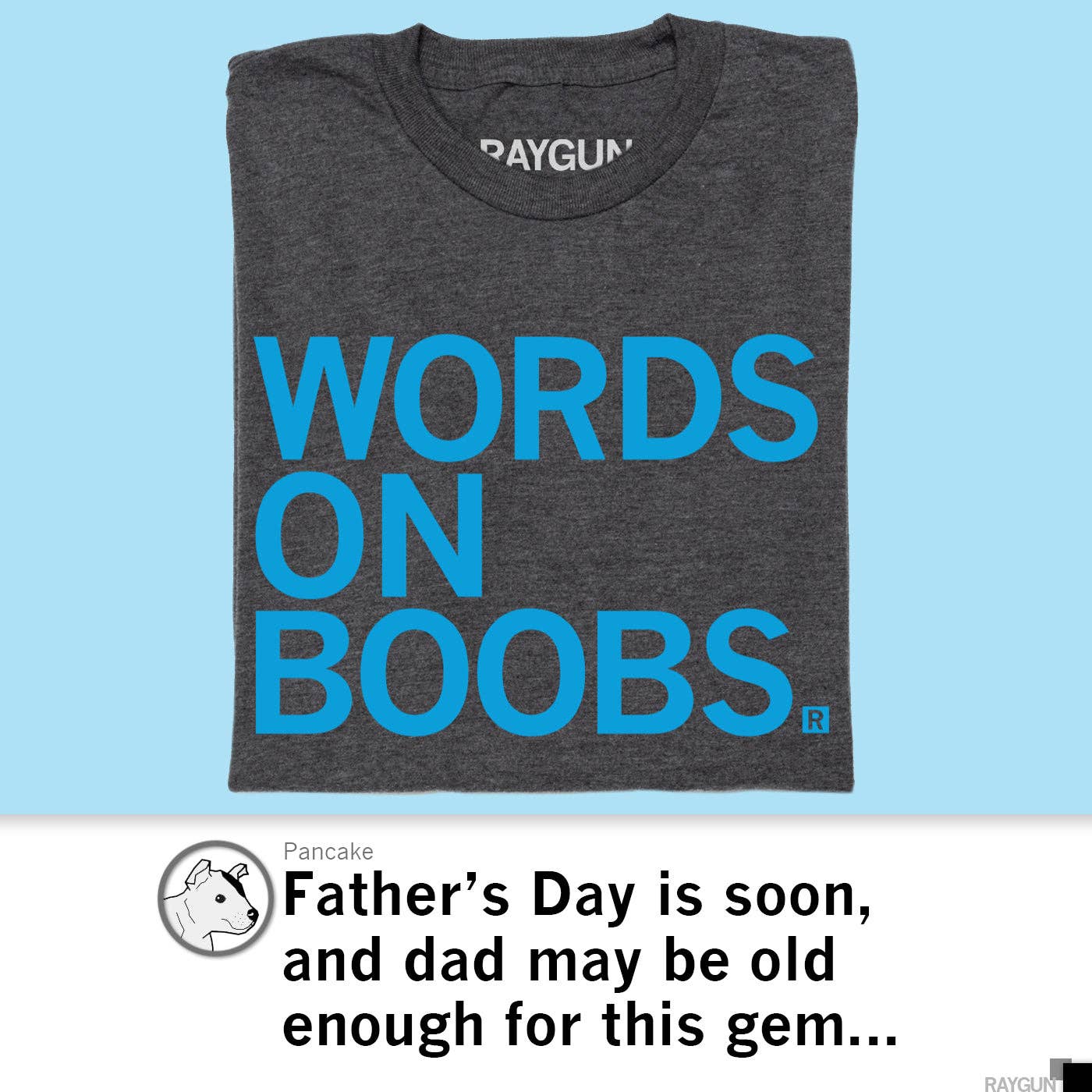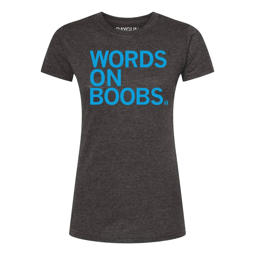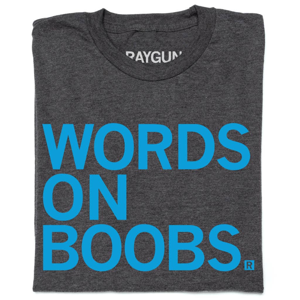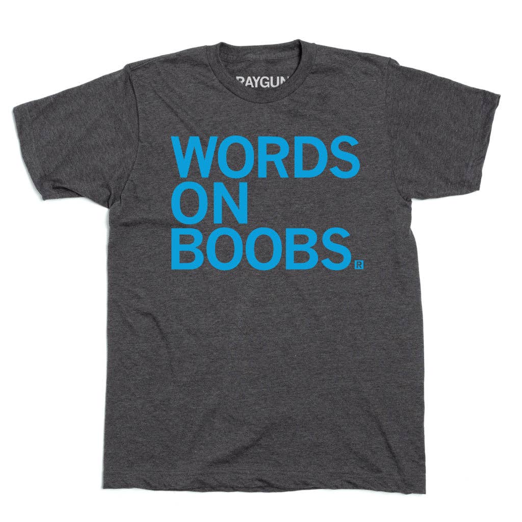 Words on Boobs. A Portion of All RAYGUN Sales Raise Money For Organizations That We Support. Brite Blue Screen Print on a Charcoal T-shirt (50% Combed Ringspun Cotton / 50% Polyester for Standard Sizes 65% Polyester/35% Combed Ringspun Cotton for Snug Sizes). Cut and sewn sweatshop free. Designed and printed by Union Labor at RAYGUN.
